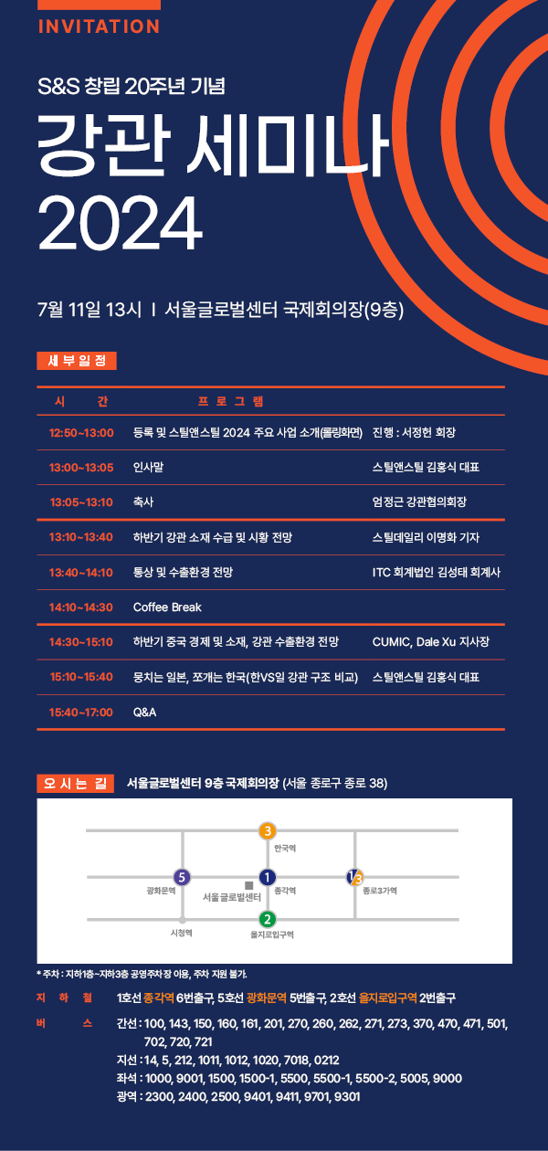 스틸앤스틸이 주최·주관하는 ‘강관 세미나 2024’가 오는 7월 11일(목) 13시~17시 서울글로벌센터 국제회의장 9층에서 개최한다.